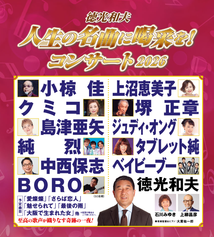 煌めきのムード歌謡コンサート 2025年12月10日 3/21(土) 19:00開演 煌めきのムード歌謡コンサート 宮崎県延岡市 3/22(日) 19:00開演 煌めきのムード歌謡コンサート 鹿児島県鹿児島市 3/24(火) 19:00開演 煌めきのムード歌謡コンサート 熊本県熊本市 3/25(水) 19:00開演 煌めきのムード歌謡コンサート 福岡県久留米市